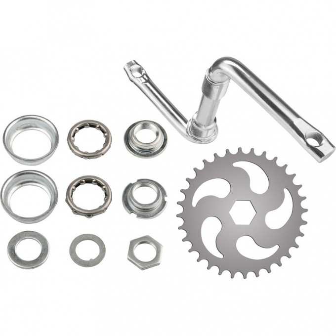 Односоставной шатун с деталями каретки: шатун 102 мм хром, звезда 32 зуба хром, 2 чашки каретки, 2 конуса каретки, стопорное кольцо, контргайка, шайба, 2 подшипника 5/16"х9, для детских велосипедов