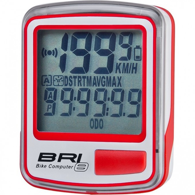 Велокомпьютер BRI-8 бело-красный, 8 функций: текущая скорость, текущая пройденная дистанция, общая пройденная дистанция, 12/24 часы, средняя скорость, максимальная скорость, время езды, сканирование данных.